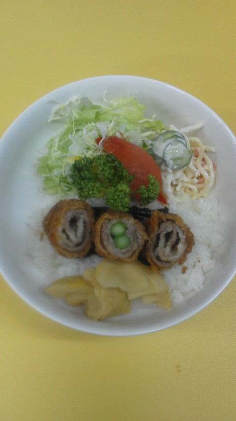 5月19日チーズカツ丼ですヽ(^^)季節のアスパラと竹ノ子が入っています(o^_^o)大地の恵みに感謝します!今週もがんばりましょうp(^-^)q
