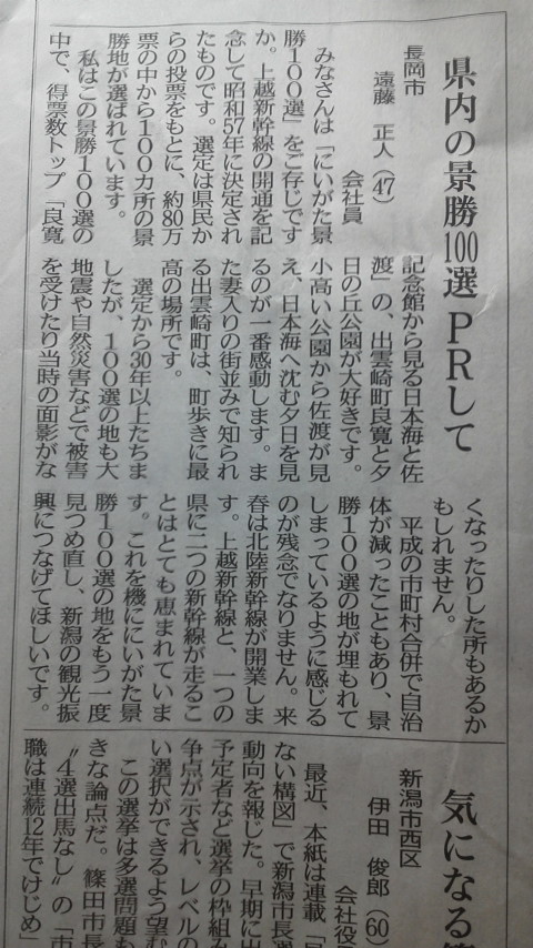 6月10日の新潟日報の窓投稿欄にあの遠藤正人くんの投稿が載っていました(゜Д゜)真面目な一面を見ましたて!(゜o゜;)彼はお店のお客さんで彼女募集中です(o^_^o)ゼヒ彼に会ってみたい女性!ママまで連絡ください(^^ゞお願いします♪