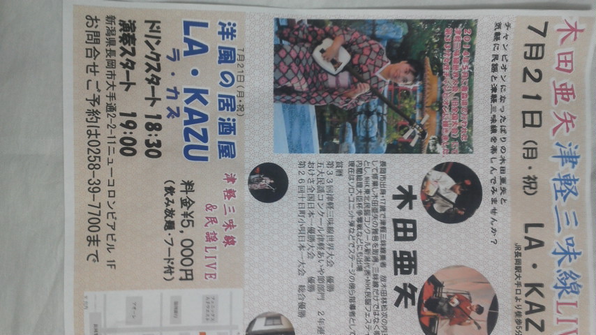 7月21日(祝祭日)木田亜矢さんがラ・カズに来ますヾ(^▽^)ノ5月に青森県で行われた津軽三味線世界大会でチャンピオンに輝きました(≧∀≦)なかなか目の前で聞くのはめったにアリマセンヨ(゜o゜;) 飲み放題で料理付きで5000円です!是非ご予約お願いしますm(_ _)m叉近々になりましたら亜矢ちゃん情報をお知らせさますね♪楽しみナッシィ〜ヾ(^▽^)ノ