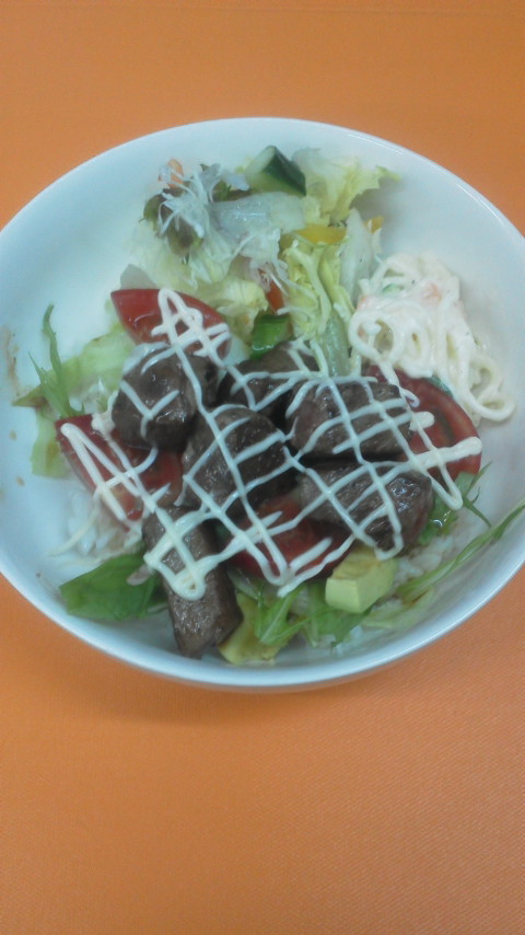 7月3日アボカドステーキ丼ですヽ(^^)アボカドをのせたサラダご飯とポン酢のカットステーキです(≧∀≦)オォ〜↑うまそぉ〜(‘-^*)ok