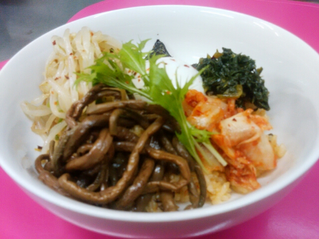 10月21日ビビンバ丼です(^_^)/皆さん元気ですか?私は夏の疲れか…(-_-)元気がイマイチです↓で…韓国パワーでアップ↑です(^_^)Vビビンバは野菜とゼンマイとタマゴをマゼマゼして食べるのでカロリーも少なめですが満腹感でいっぱいになりますよ(^^)タニタに負けないなぁ…♪