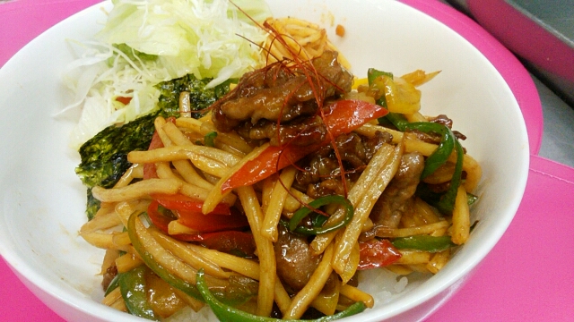 11月12日青椒肉絲丼です(^_^)/ご飯が進みます!詳しく言えばご飯はコシヒカリの新米で~す(@_@)delicious!新潟県人で良かった…♪いただきます(^_^)V