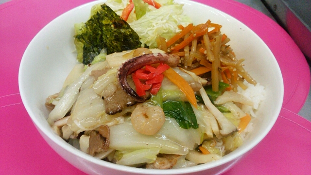 12月11日八宝菜丼です(^_^)/今日も寒いですね(>_<)野菜たっぷりにエビにイカに寒さがぶっ飛びデスから…♪アッ昨日ボーナスが出た皆さん今年も頑張りましたね\(^_^)/これからクリスマスやお正月と楽しみデスね…(^^)ラ・カズ(*’-‘)でもクリスマス会しますから楽しみにしていてね♪