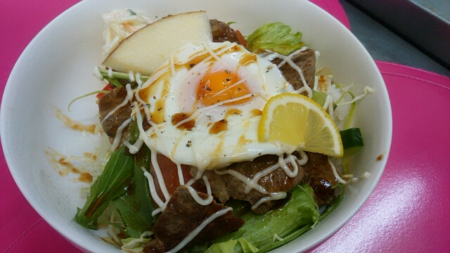 2月19日サラダ&ステーキ丼です(^_^)/半熟卵とマゼマゼしてくださいね♪サラダいっぱいなのでヘルシー&ボリュームデス(#^.^#)どっち?やっぱボリュームでしょう~(@_@)今日は雨水デスね♪この日にお雛様を飾ると良縁に恵まれるそうです(^_^)V飾るしかない!