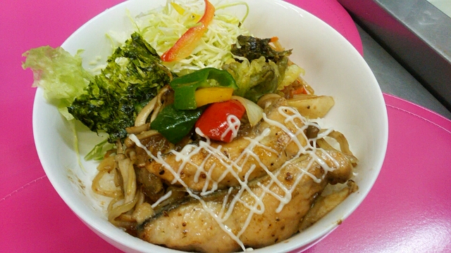 2月25日鮭ムニエル丼です(^_^)/鮭の下にはエリンギとシメジと玉ねぎとパプリカでカラフルデス(#^.^#)栄養を付けて今日もぶっ飛ばしデス!カズくん退院おめでとう(^^)&お疲れちゃん(>_<)