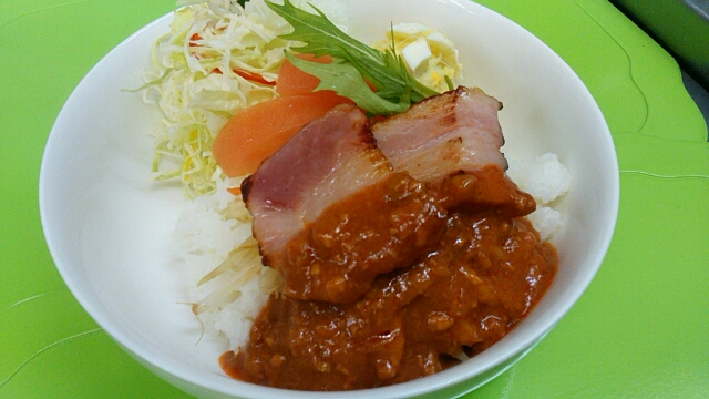 2月26日厚切りベーコン丼です(^_^)/ベーコンステーキになっています(^^)ヨネックスのレストランにメニューにあるのをパクリました(^^;だって美味しいんだもん(*_*)今日と明日てランチ営業もしばらくお休みしますが…m(__)m頑張りま~す(^_^)V