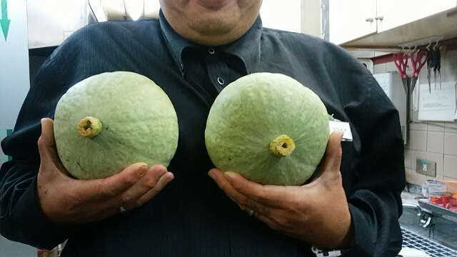 渡辺クンから頂きました!南瓜です(^_^)V洋一クンが持つとまるで力士の胸のようです…(^^;